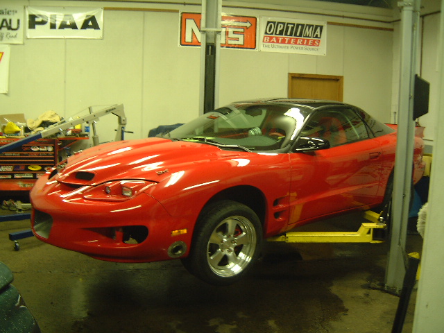 A pic of the WS6 on the hoist...notice the side exit 3" exhaust...Street legal? We will find out...lol |